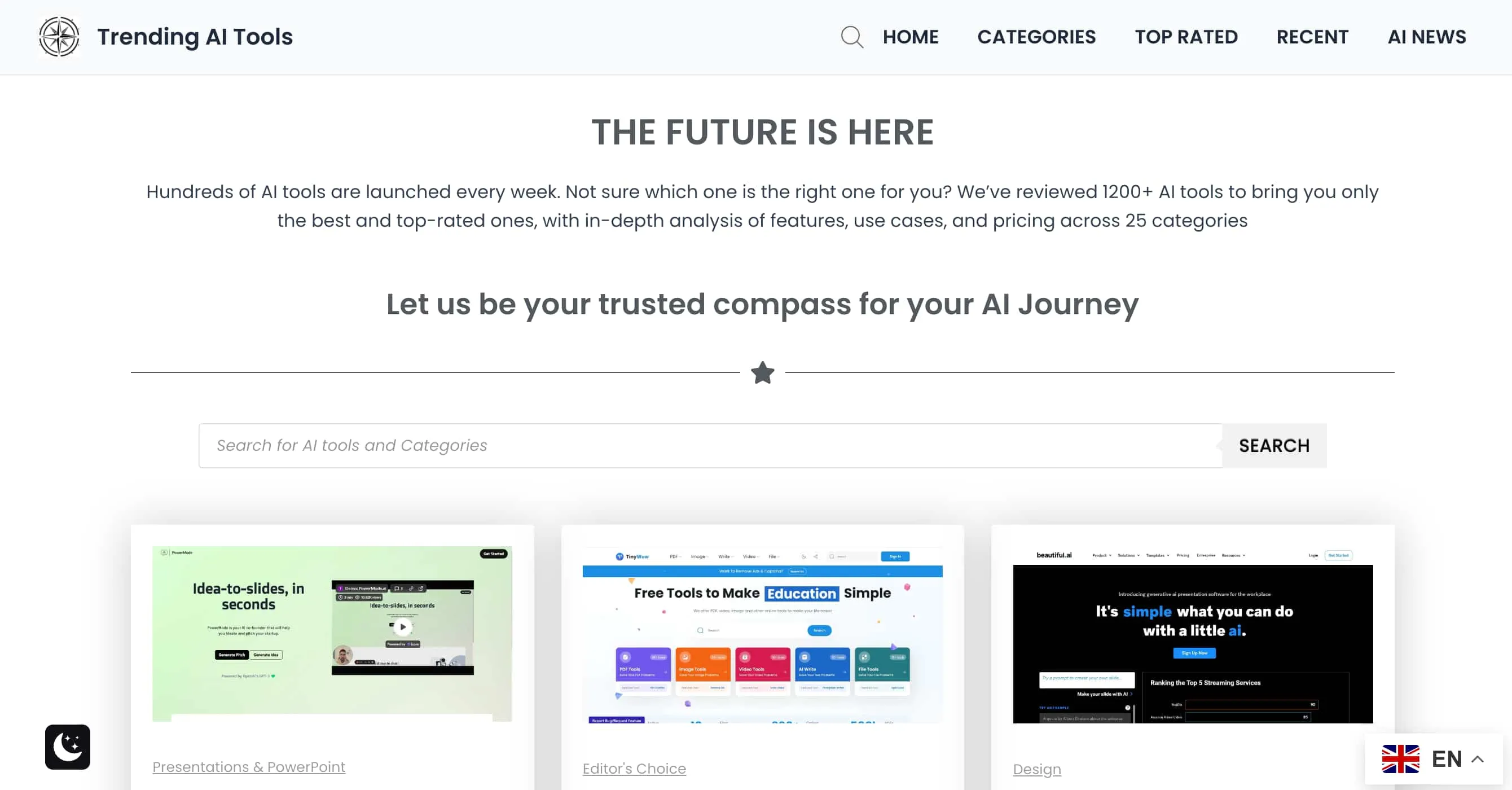 Trendige KI-Tools dient als zuverlässiger Kompass für die Navigation in den Hunderten von KI-Tools, die jede Woche auf den Markt kommen. Mit eingehenden Bewertungen von über 1200 KI-Tools konzentriert sich diese Plattform nur auf die leistungsstärksten und am besten bewerteten Tools und bietet detaillierte Analysen von Funktionen, Anwendungsfällen und Preisen in 25 Kategorien.