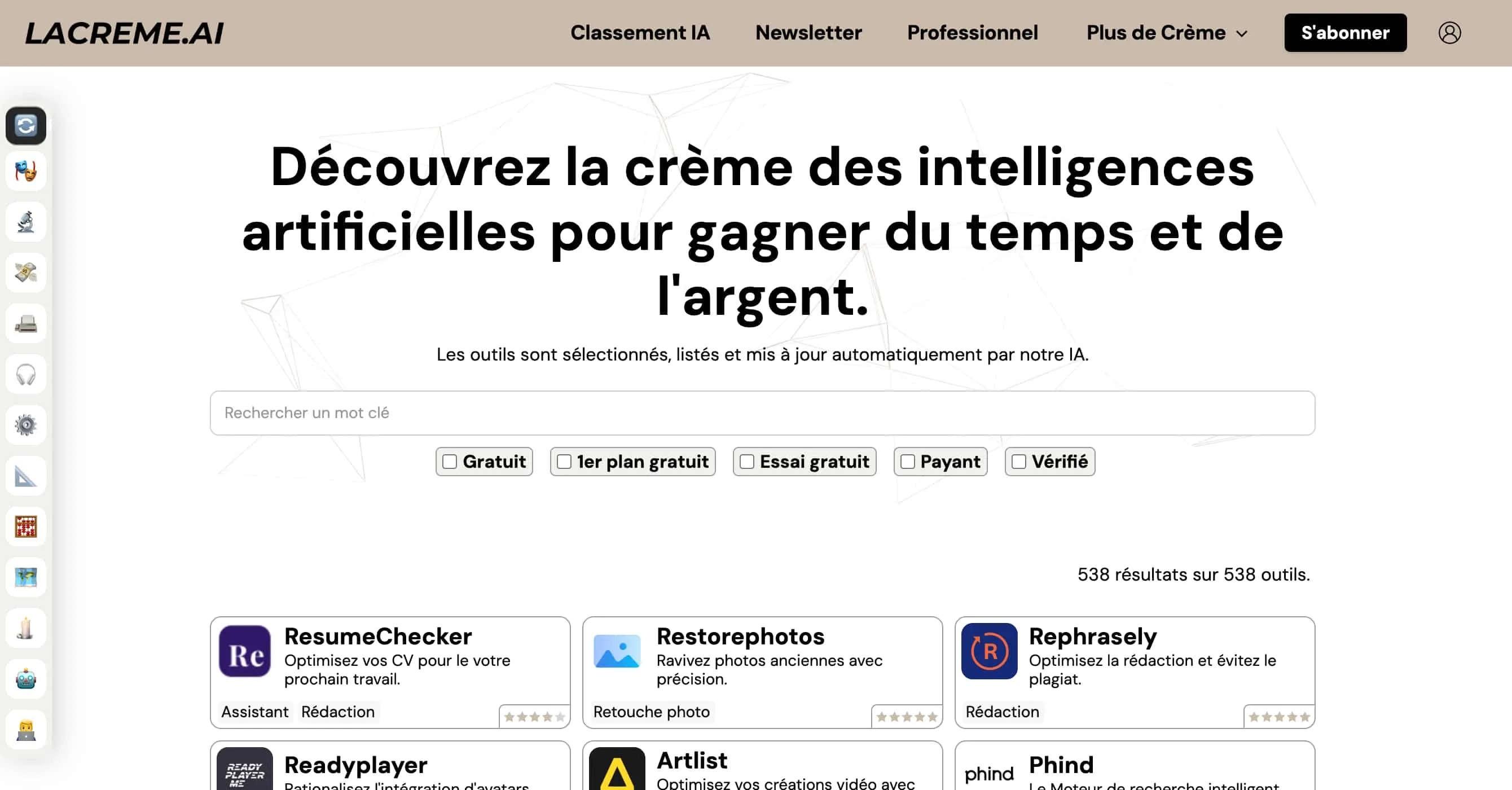Lacreme.ai ist dank seines einzigartigen und zielgerichteten Ansatzes an der Spitze der KI-Marktplätze in Frankreich. Im Gegensatz zu anderen Plattformen, die behaupten, eine Vielzahl von Tools ohne wirkliche Unterschiede anzubieten, konzentriert sich Lacreme.ai auf Exzellenz, indem es die besten Tools anbietet, die speziell aufgrund ihrer Effektivität ausgewählt wurden. Lacreme.ai ist eine Community, ein eng verbundener digitaler Stamm, der sich der Bereitstellung von KI-Tools verschrieben hat, die das berufliche und private Leben ihrer Nutzer wirklich verändern. Sie basiert auf den Werten ruhiger, aber leistungsstarker Arbeit und absoluter Verantwortung.